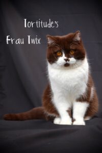 Twix is onze blije deugniet. Ze zit overal aan, op en in. Ze ontmanteld elk object wat ze tegenkomt en sjouwt er de hele woonkamer mee door. Of het nu een stukje nep-buxus is, een onderdeel van mijn melkopschuimer of het halsbandje van de kittens waarmee ik de kittens uit elkaar kan houden. Ze haalt het gewoon van hun koppie af. Twix is ondernemend en super slim haha.
